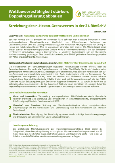 Deutschland ist führend in der Ölsaatenverarbeitung Europas. Um diese Vorreiterrolle zu erhalten, ist die Branche auf faire Wettbewerbsbedingungen im EU-Binnenmarkt angewiesen. Doch mit der Novelle der 31. Verordnung zur Durchführung des Bundes-Immissionsschutzgesetzes (31. BImSchV) wurde im Dezember 2023 ein industriepolitisch schädlicher Sonderweg eingeschlagen: Über die EU-konforme Zielvorgabe zur stufenweisen Reduktion der Gesamtemissionen von Hexan um 50 % bis 2031 hinaus wurde an einem zusätzlichen nationalen Abluftgrenzwert von 20 mg n-Hexan/m³ festgehalten. Diese europaweit einmalige Doppelregulierung ist klimapolitisch kontraproduktiv, toxikologisch unbegründet und ein Paradebeispiel für überbordende Bürokratie.